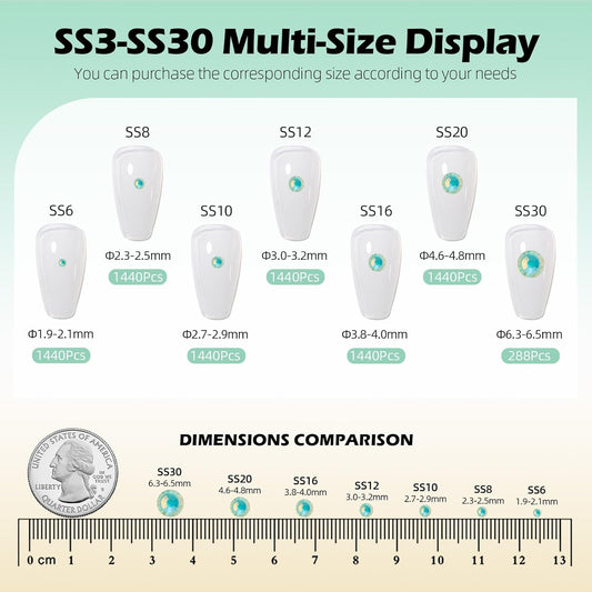 F Light Green Flatback Rhinestones, Glass Rhinestones for Nail Art and Craft, Glue Fix, Loose Crystal Gemstones(F Light Green, SS10, 1440pcs, 2.7-2.8mm)