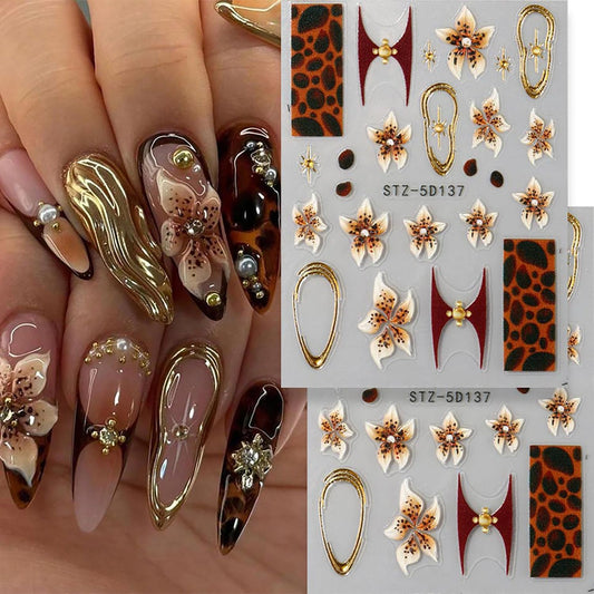 Fall Nail Stickers Leopard Flower Nail Decals Autumn Nail Art Supplies 5D Embossed Self Adhesive Leopard Print Floral Nail Design Supplies Brown Fall Stickers for Women DIY French Manicure Accessories