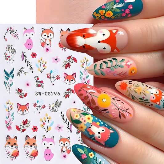 Fall Nail Art Stickers, Cute Fox Nail Art Decals 3D Self-Adhesive Cotton Fox Nails Stickers Autumn Blossom Flowers Nail Design 6Pcs Nail Art Supplies for Women Nail Decoration