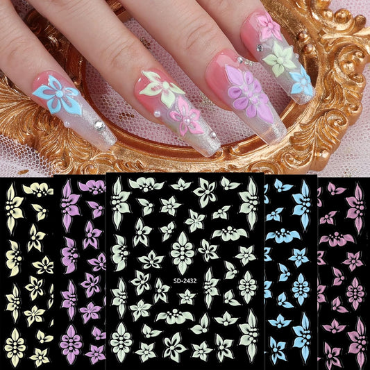Flower Nail Art Stickers Women Spring Summer Embossed Floral Leaves Holographic Manicure Decals Self Adhesive DIY Decorations Supplies 5 Sheets