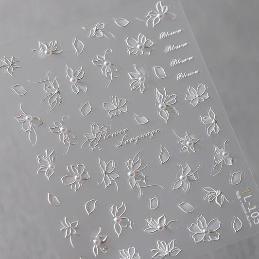 Flower Nails Stickers White Nail Decals with Pearl Design Glue on Nails Sticker Floral Nails Art Stickers 5D Embossed Self Adhesive for Women Girls Kid Manicure Charms Decoration