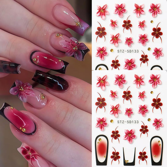 Flowers Nail Art Stickers Decals 5D Embossed Self-Adhesive Summer Flowers Nail Stickers French Tip Design Nail Decals Spring and Summer Flower Sticker for Women DIY Manicure Decoration Supplies