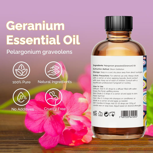 Geranium Essential Oil 4 Oz, 100% Pure Geranium Oil for Diffuser, Skin, Hair, Face, Soap & Candle Making, Aromatherapy & Massage