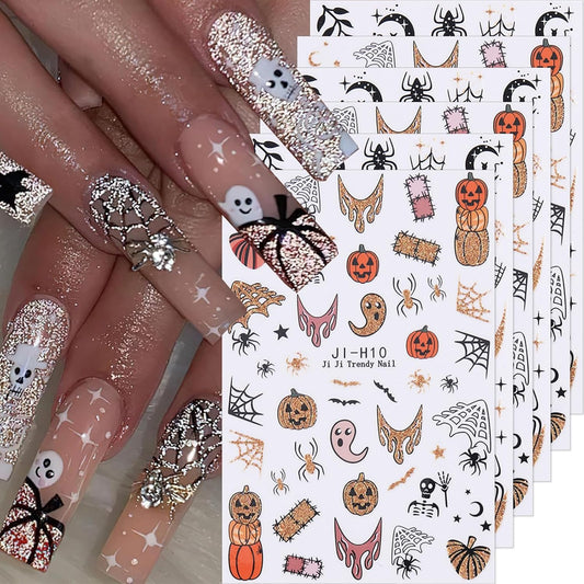 Halloween Nail Decals - 10 Sheets Self-Adhesive Nail Design Stickers with Pumpkin, Spider Web, Bleeding Nail Art, Spooky Ghost, Flowers, Boo Bat for Women DIY Halloween Nail Decor