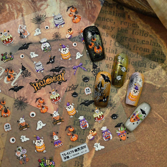 Halloween Nail Stickers 6PCS - Spooky Ghost Pumpkin Skull Cat Glitter Nail Decals, 3D Self-Adhesive Nail Art Supplies for Women, Festive Holiday Nail Decorations
