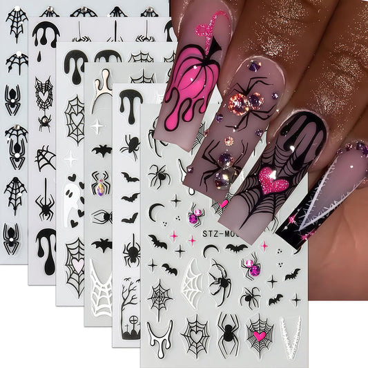 Halloween Nail Stickers for Nail Art 6 Sheets Self-Adhesive Spider Web Ghost Diamond Spider Bat Nail Art Stickers Halloween Spooky Decals Spiders Bat Sticker Holiday DIY Manicure Decoration for Women