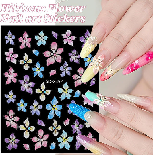 Hawaii Flower Nail Stickers 6 Sheets 5D Embossed Floral Nail Decals Pink Blue Hibiscus Nail Art Stickers for Women DIY Manicure Supplies Decorations