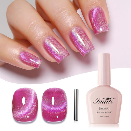 Imtiti Cat Eye Gel Nail Polish, Hot Pink Holographic Magnetic Crystal Nail Gel Polish With Magnet Glittery Galaxy Spring Summer Kit Soak Off UV Led 10ML