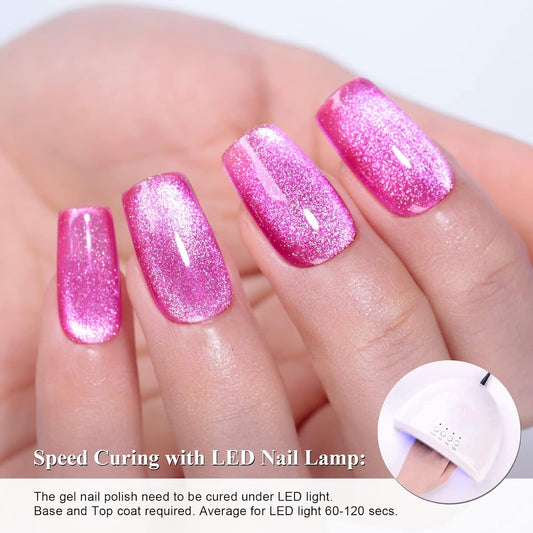 Imtiti Hot Pink Champagne Pink Color Gel Nail Polish, 0.5fl oz Holographic 9D Cat Eyes Glitter Magnetic Gel Polish with Magnetic Stick for Nail Salon