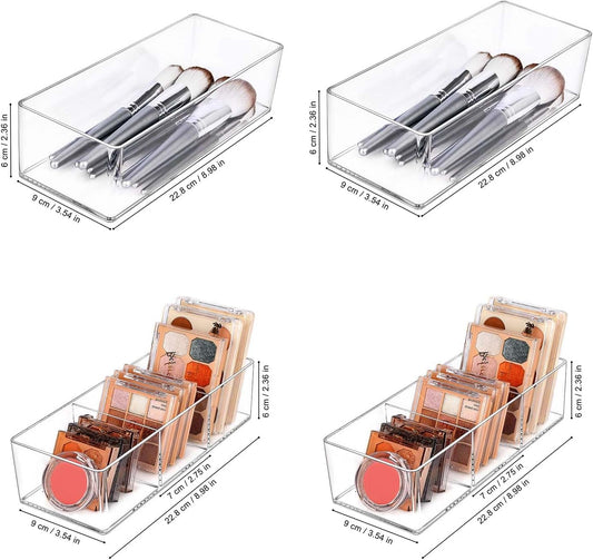JessLab Acrylic Organizers, Bathroom Organizer for Drawer, 4-Pack Cosmetic Display Cases for Vanity, Countertop, Desk, Kitchen, and Makeup Storage, 2 of 1-Compartment and 2 of 3-Compartment