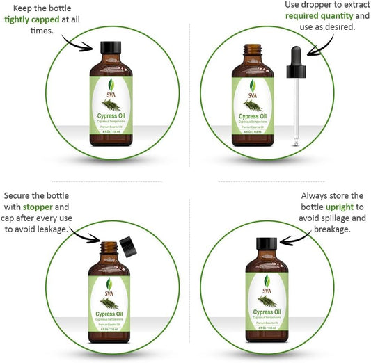 SVA Cypress Essential Oil – 4 Fl Oz – 100% Natural Cypress Oil - for Diffuser, Hair Care, Face, Skin Care, Aromatherapy, Scalp and Body Massage, Soap and Candle Making – with Dropper