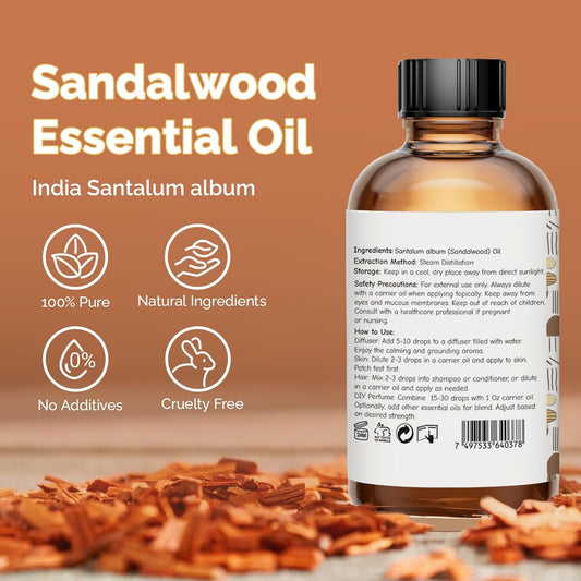 Sandalwood Essential Oil 4 Oz, 100% Pure Sandalwood Oil for Diffuser, Skin, Hair, Body & Face, Perfume Base Note for Men & Women, Aromatherapy & Massage