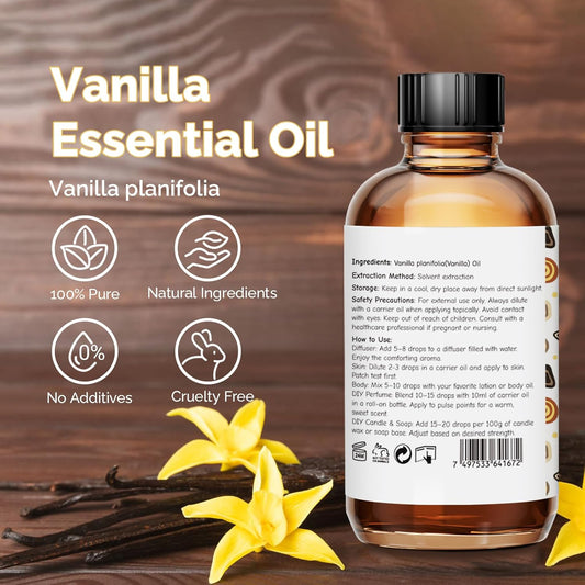 Vanilla Essential Oil 4 Oz, 100% Pure Vanilla Oil for Diffuser, Skin, Hair, Body & Face, Perfume, Sweet Creamy Scent for Relaxation, Aromatherapy & Massage