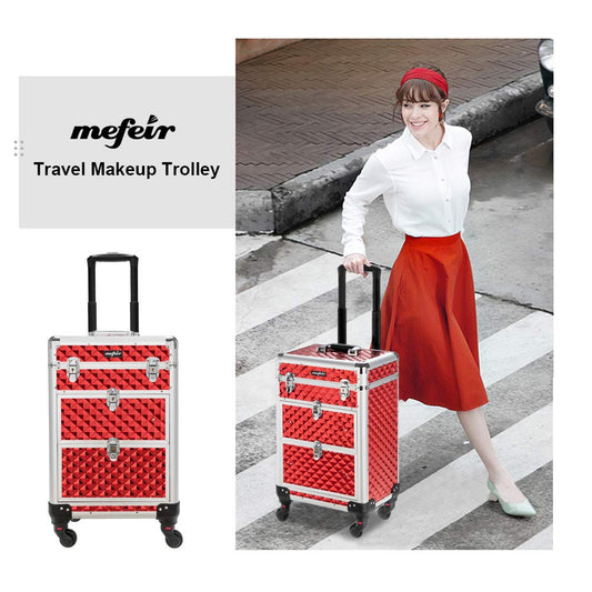 mefeir Aluminum Rolling Makeup Train Case, Portable Makeup Organizer Suitcase, Cosmetic Storage Box, Travel Beauty Luggage Trolley Lockable w/4 Removable Wheels & 2 Sliding Drawers (Red)