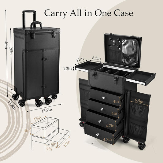 Joligrace Professional Rolling Makeup Case 4 Drawers Pro Makeup Artist Cosmetic Train Case Hairstylist Travel Case Portable Make Up Station with Multiple Compartments Extra Large - Black