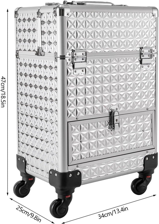 Rolling Makeup Train Case Professional Cosmetic Organizer Large Capacity Trolley Makeup Travel Case with 360° Swivel Wheels for Makeup Artist (Silver)