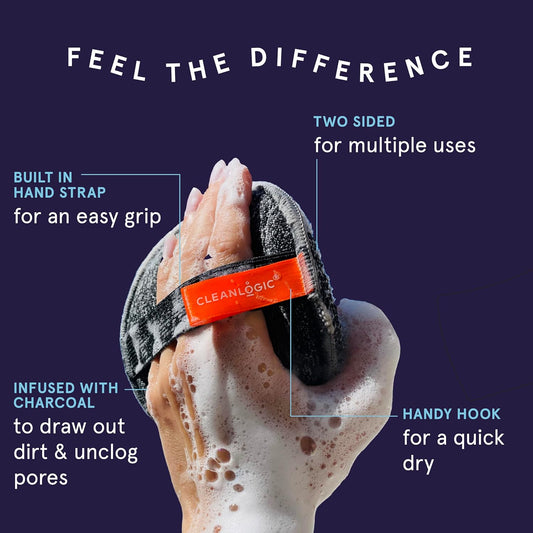 Cleanlogic Detoxify Purifying Charcoal Infused Exfoliating Body Scrubber, Dual-Texture Round Exfoliator Tool for Smooth, Clean Skin, Daily Skincare Routine, 3 Count Value Pack