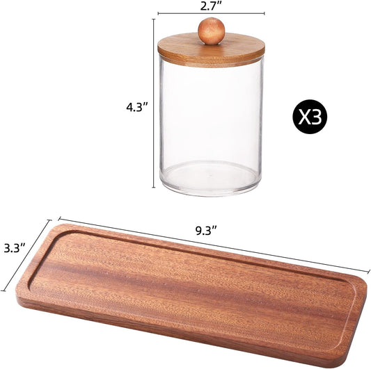 Tbestmax 10 Oz Cotton Swab/Ball/Pad Holder with Vanity Tray, Qtip Apothecary Jar, Clear Bathroom Containers Dispenser for Storage 3 Pack Wood Lids