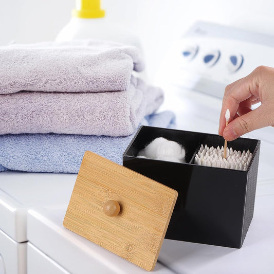 Ohlove Qtip Holder with Bamboo Lids, 3 Compartments Cotton Ball/Swabs Dispenser, Apothecary Jar Plastic Container for Storage and Organizer (Black)