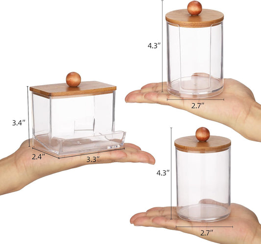 Ohlove Qtip Holder with Bamboo Lids, 3 Compartments Cotton Ball/Swabs Dispenser, Apothecary Jar Clear Plastic Bathroom Container for Storage and Organizer
