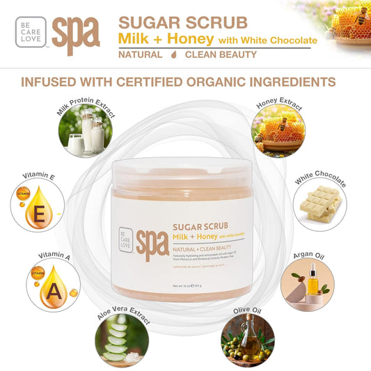 BCL SPA sugar scrub | organic Milk and Honey with White Chocolate exfoliating body scrub removes dead, dry skin for a soft & hydrated feel, nourishing essential body care 16 oz