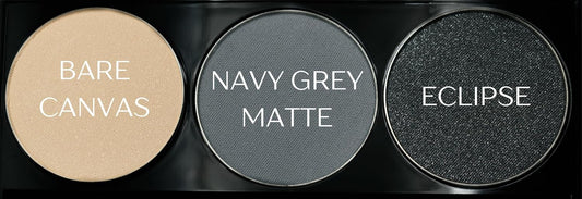 Off White, Matte Medium Grey Blue, and Glitter Black Deep Navy Blue Vegan Eyeshadow Trio Palette; Talc, Paraben & Cruelty Free