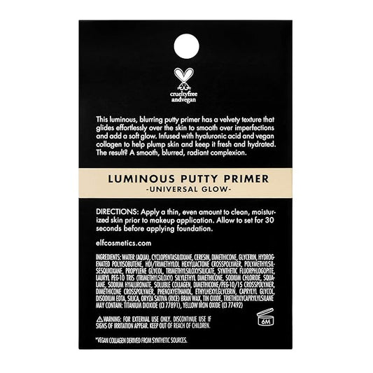 e.l.f. Luminous Putty Primer, Skin Perfecting, Lightweight, Silky, Long Lasting, Hydrates, Creates a Smooth Base, Illuminates, Plumps, Infused with hyaluronic acid and vegan collagen, 0.74 Oz