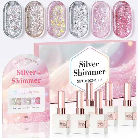 Double Rhythm 0.5 Oz Glitter Gel Polish Set of 6 Color with Display Board 15 ml Full Size Kit Shimmer Reflective Sparkle Soak Off Manicure Salon DIY at Home (Gold Silver Light Pink Rose-T6-35)