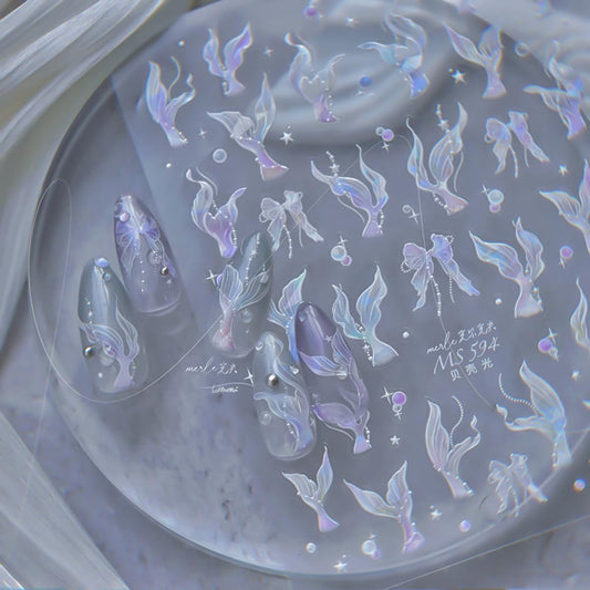 Mermaid Nail Art Stickers Sparkly Fishtail Nail Stickers 5D Embossed Shell Light Style Nail Decals Accessories Mermaid Adhesive Slider Manicure Supplies for Women DIY Decorations