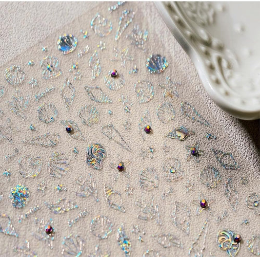 Laser Ocean Nail Stickers Gold Conch Nail Designs Self-Adhesive Silver Shell Nail Decals 5D Embossed Aurora Starfish Summer Sticker Manicure Accessories for Women Girls DIY Acrylic Nails 2 Sheets