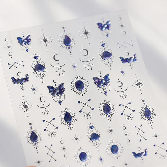 Blue Nail Art Sticker Decals Jelly Nail Stickers 5D Embossed Self Adhesive with Line Design Star Moon Nails Decals Nails Charms for Women Girls Kid Manicure Supply DIY Decoration Accessories