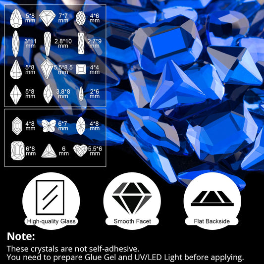 18 Styles Multi-Shaped Glass Gemstones for Nails and 6 Sizes Round Crystal Rhinestones Kit #7, Royal Blue Nail Art Charm Bead Manicure Decoration with Pickup Pencil and Tweezer