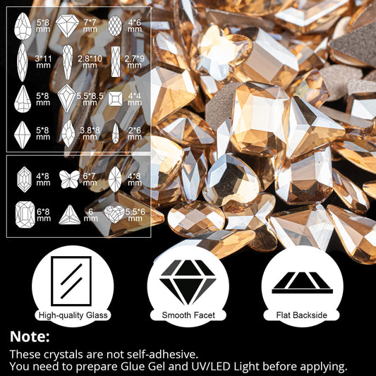 18 Styles Multi-Shaped Glass Gemstones for Nails and 6 Sizes Round Crystal Rhinestones Kit #5, Champagne Nail Art Charm Bead Manicure Decoration with Pickup Pencil and Tweezer