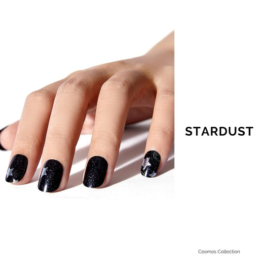 Semi Cured Gel Nail Strips - NAILOG 34 Pcs Gel Nail Stickers Buy 2 Get 1 UV Light | Long Lasting Nail Wraps with Glossy Gel Finish Black, Stardust