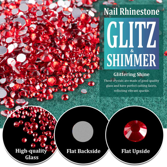 3440PCS 6 Sizes Red Glass Crystal Kit with Pickup Pen + Tweezer Tools for Iridescent Shine Nail Art Manicure Makeup DIY Deco Flatback Round Bead Rhinestone Gem Jewelry Diamond