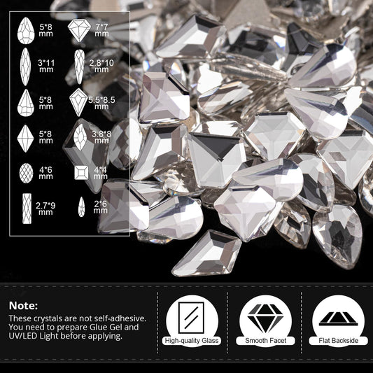 Rhinestones for Nails, Manicure Kit with Nail Rhinestone Glue Gel, Multi Shapes Clear Glass 3D Nail Charms + Flatback 2-5mm Round Beads & Gem Glue for Nails (UV/LED Needed) with Dotting Tools