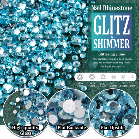 Multi Shapes Lake Blue 3D Glass Crystal Nail Art Rhinestones Kit with Flatback Round Bead Charm Gem Stone Jewelry Diamond with Pickup Pen + Tweezer for Manicure Makeup DIY Craft Decoration