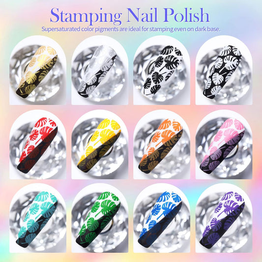 Born Pretty Nail Stamping Polish, Fingernail Stamp Polish Set Manicure Print Nail Polish for Plates 12 Colors Bulk Gift Collection 10ml 0.34fl oz Ideal Gifts