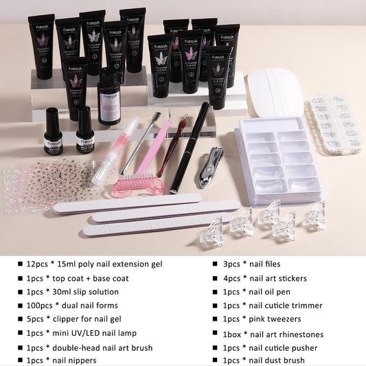 Poly Nail Gel Kit with UV Light, 12 Colors Clear Nude Pink Iridescent Glitter Extension Gel Builder Gel Starter Kit Base Top Coat Set Slip Solution Nail Gel Kit for Beginners with Everything