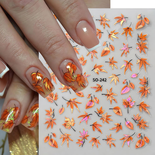 5 Sheets Fall Nail Art Stickers Autumn Maple Leaf Nail Decals 3D Self-Adhesive Thanksgiving Day Maple Leaf Nails Decals with Gold White Orange Green Leaves Nail Stickers for Women Manicure Decoration