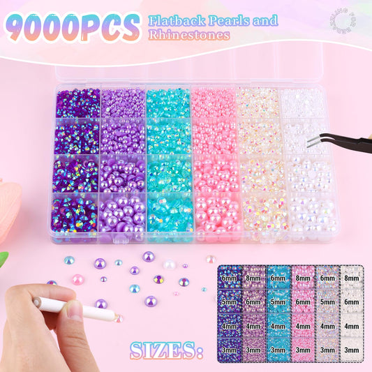 9000Pcs Flatback Pearls and Rhinestones for Crafting, Pink Purple White Mixed Size 3-8mm Resin Rhinestones and Half Pearls for Bedazzling, Nail Art with Tweezers and Pickup Pencil