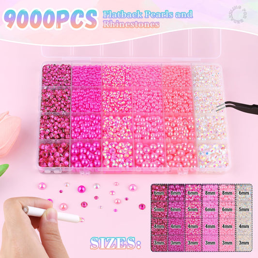 9000Pcs Flatback Pearls and Rhinestones for Crafting, Hot Pink Light Pink Mixed Size 3-8mm Resin Rhinestones and Half Pearls for Bedazzling, Nail Art with Tweezers and Pickup Pencil