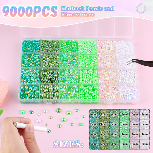 9000Pcs Flatback Pearls and Rhinestones for Crafting, Green White Mixed Size 3-8mm Resin Rhinestones and Half Pearls for Bedazzling, Nail Art with Tweezers and Pickup Pencil