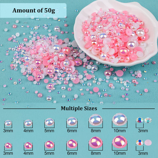 50g Flatback Pearls and Rhinestones Set 1-Pink&White, Mixed Size 3-10mm Resin Rhinestones and Half Pearls for Nail Art and Crafts and Decoration with Tweezer and Pickup Pencil