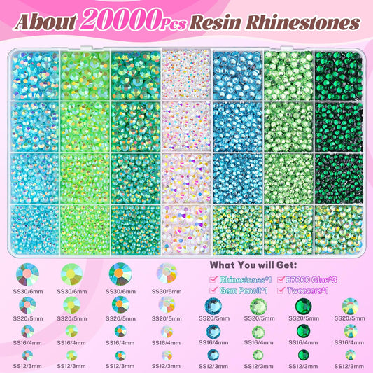 20000Pcs Green Rhinestones for Bedazzling with 3Pcs B7000 Jewelry Glue, Resin Rhinestones for Crafting Crafts,Bedazzler Kit Flatback Gems for Clothing Shoes Tumblers Nail Art
