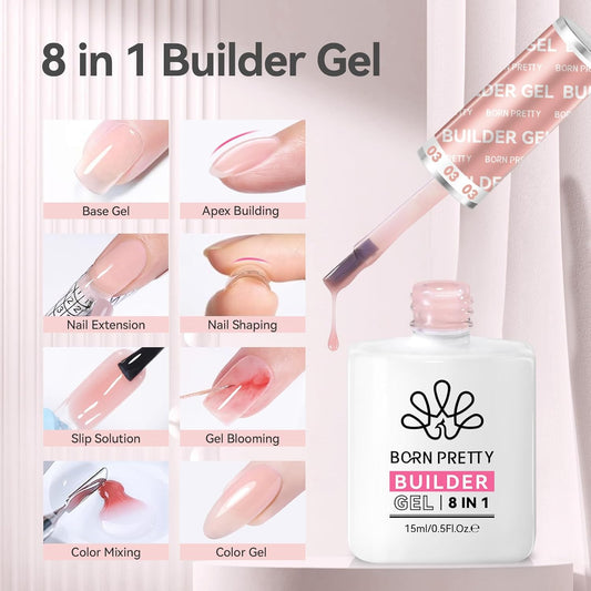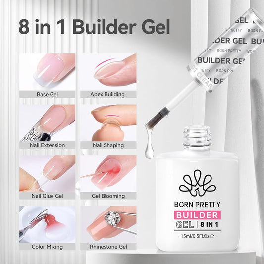 Born Pretty Builder Gel for Nails 8-in-1,15ML Clear and Cover Pink Builder Nail Gel Set, Transparent Extension Gel Rhinestone Glue for Nail Art Base Gel, LED Nail Lamp Cured Hard Gel Builder