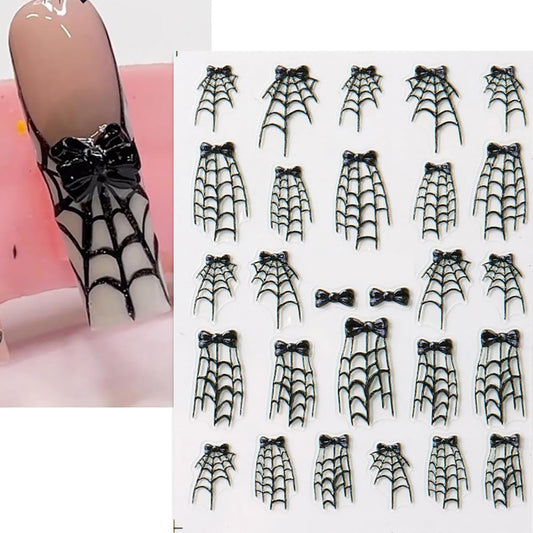 Spider Web Nail Stickers 5D Embossed Halloween Nail Decals for Press Ons 2PCS Self-Adhesive Black Cobweb Bow Design Halloween Nail Charms Holiday Nail Decorations Nail Art for Women DIY Manicure