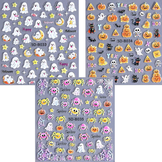 3 Sheets Halloween Nail Art Stickers 5D Embossed Nails Sticker Star Pumpkin Bat Spider Design Cute Ghost Nail Stickers for Women Girls Nail Decoration