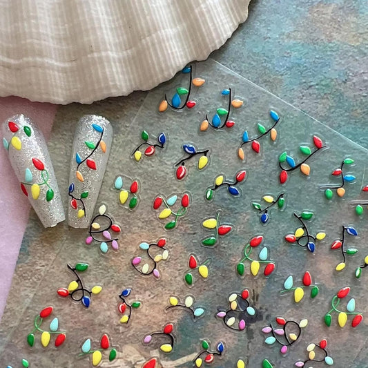 2Pcs Christmas Nail Art Stickers Decals 5D Embossed Christmas Nail Decals Colorful Light String Nail Stickers Xmas Lanterns Nail Supplies New Year Winter Nails Supplies for Women Manicure Tip Decor