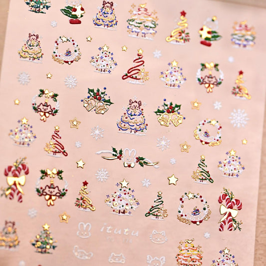 Christmas Nail Stickers for Nail Art Cute Bear Christmas Tree Wreath Glitter Gold Nail Art Stickers 5D Embossed Winter Nail Decals 3D Self-Adhesive Nails Supply Manicure Sliders for Nails Decoration